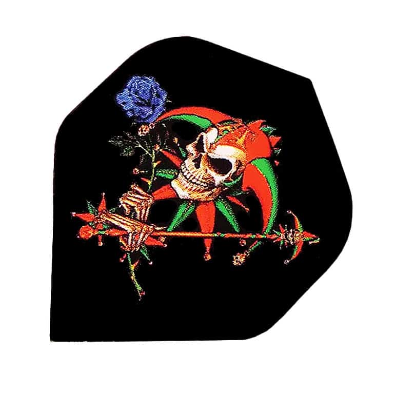 Unleash chaotic charm with the Alchemy Dart Flights – No2 – Standard – Dead Fool’s Rose. This bold design features a skeletal jester clutching a spiked staff and a haunting blue rose—blending dark humor with gothic flair. It’s a nod to those who play with edge and never follow the rules.