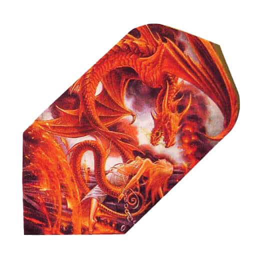 Ignite your setup with the Alchemy Red Dragon Slim Dart Flights. These flights feature a vivid fantasy scene of a mighty red dragon towering over a chained warrior woman, creating a striking look that stands out at any oche.