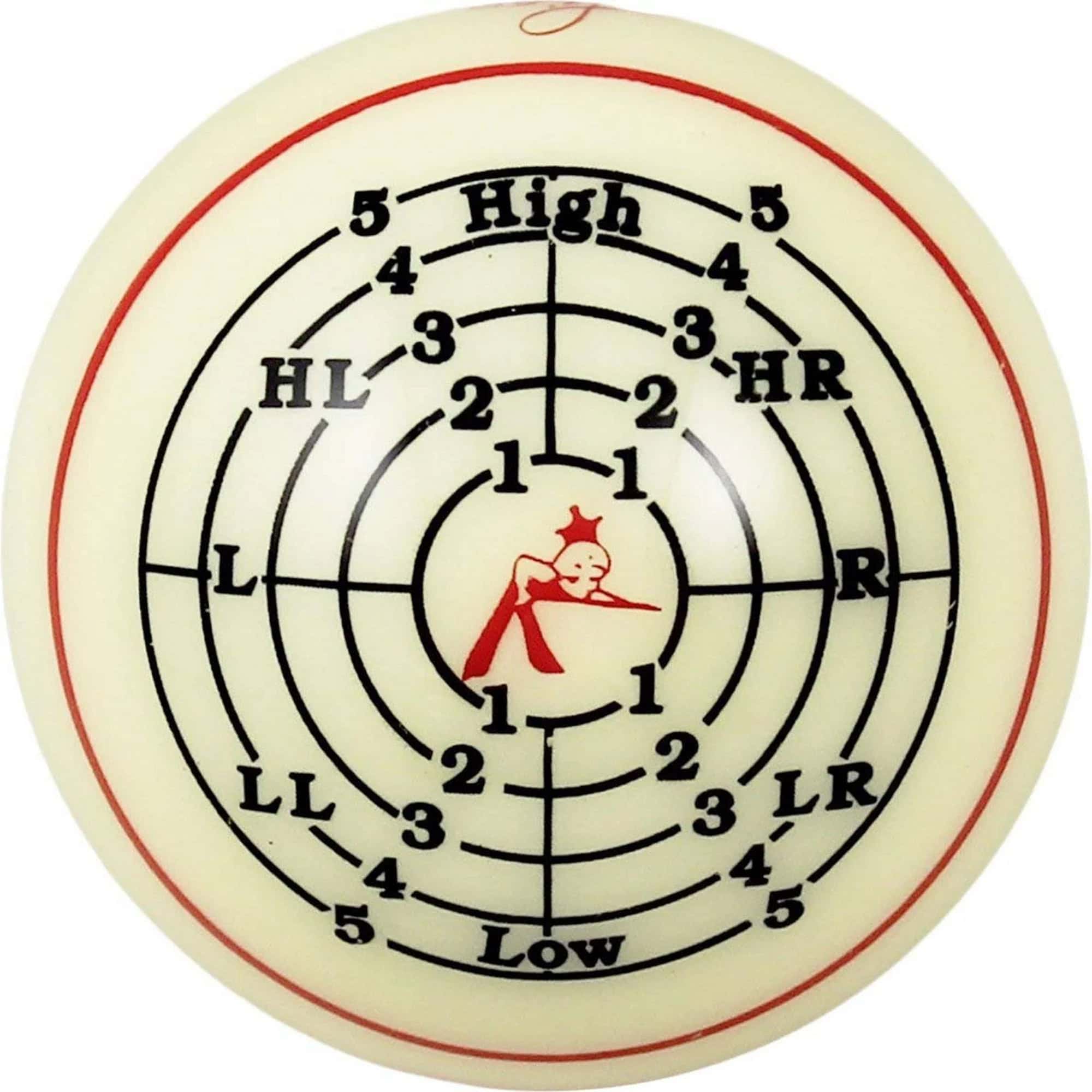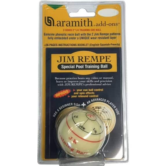 • Aramith 2 1/4″ Jim Rempe training cue ball with dual-sided patterns