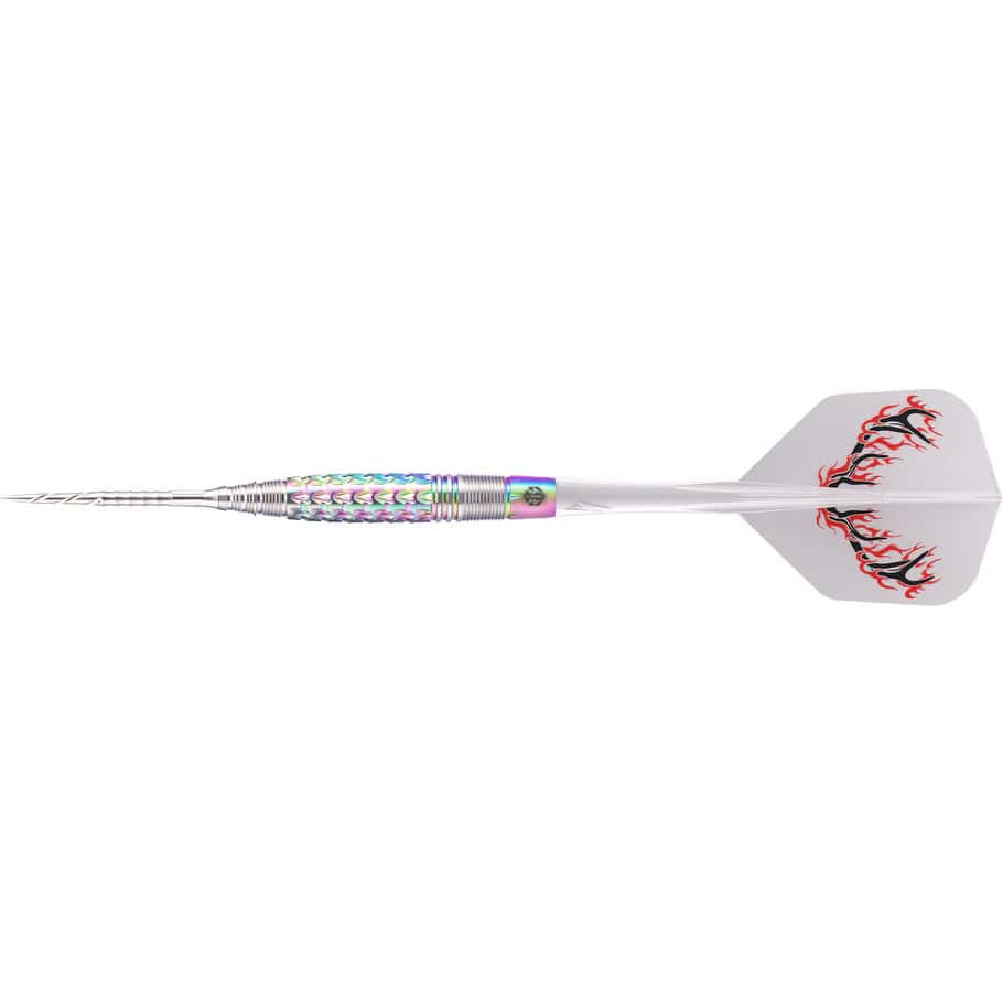 Achieve next-level precision with the Caliburn Player Darts – Steel Tip – 95% Tungsten – Rynit – 23g edition. Featuring a sleek curved barrel crafted from 95% tungsten, these steel-tip darts offer a perfect balance of style and function. The vibrant rainbow coating adds a bold visual edge, while the ringed and milled grip pattern ensures exceptional control and consistency with every throw.