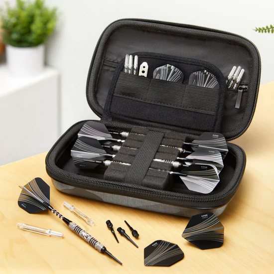Inside, soft foam inserts hold each dart securely in place, so they won’t move or rattle during travel. In addition, six perfect-fit pockets and a large zippered section make it easy to store shafts, flights, and small accessories. Thanks to its textured grip and raised ridges, the case stays steady in your hand and won’t slide off tables or counters.