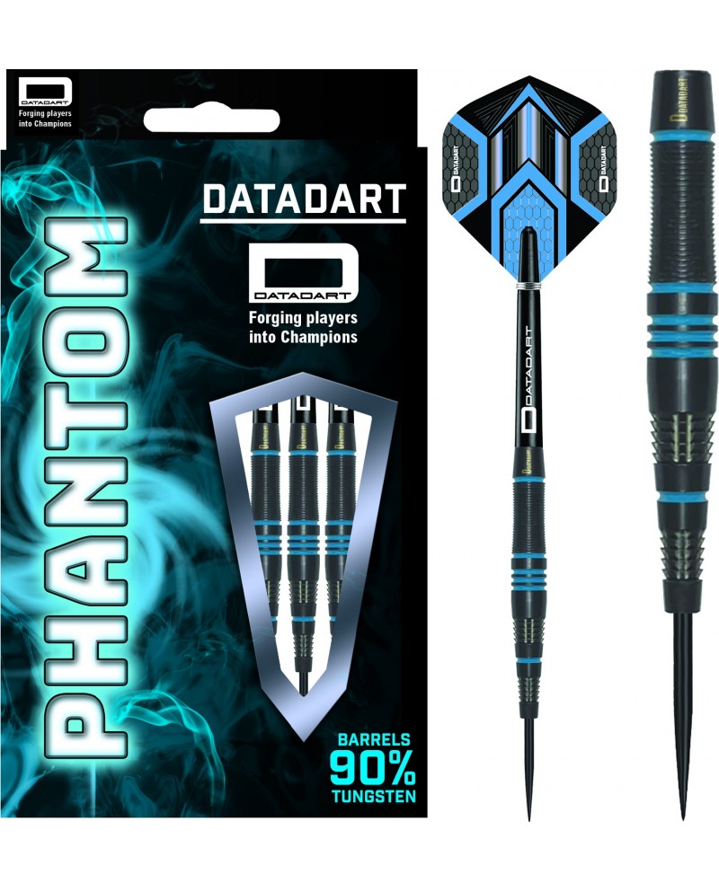 The Datadart Phantom brings precision engineering and striking style together in a sleek, high-performance dart built for consistency and feel. Crafted from 90% tungsten, the 26g Phantom features a balanced profile with clean cuts, enhanced grip, and a durable black titanium coating accented by vivid blue rings. It delivers a confident hold and smooth release, making it a dependable choice for competitive and casual throwers alike.