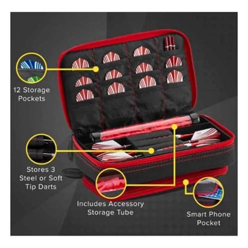 A zippered exterior pocket adds quick access for personal items or frequently used dart tools, while the striking black and rubycolor combination and subtle branding give it a bold, modern look. Compact yet comprehensive, the Plazma is ideal for both steel and soft tip players who want maximum organization without bulk.
