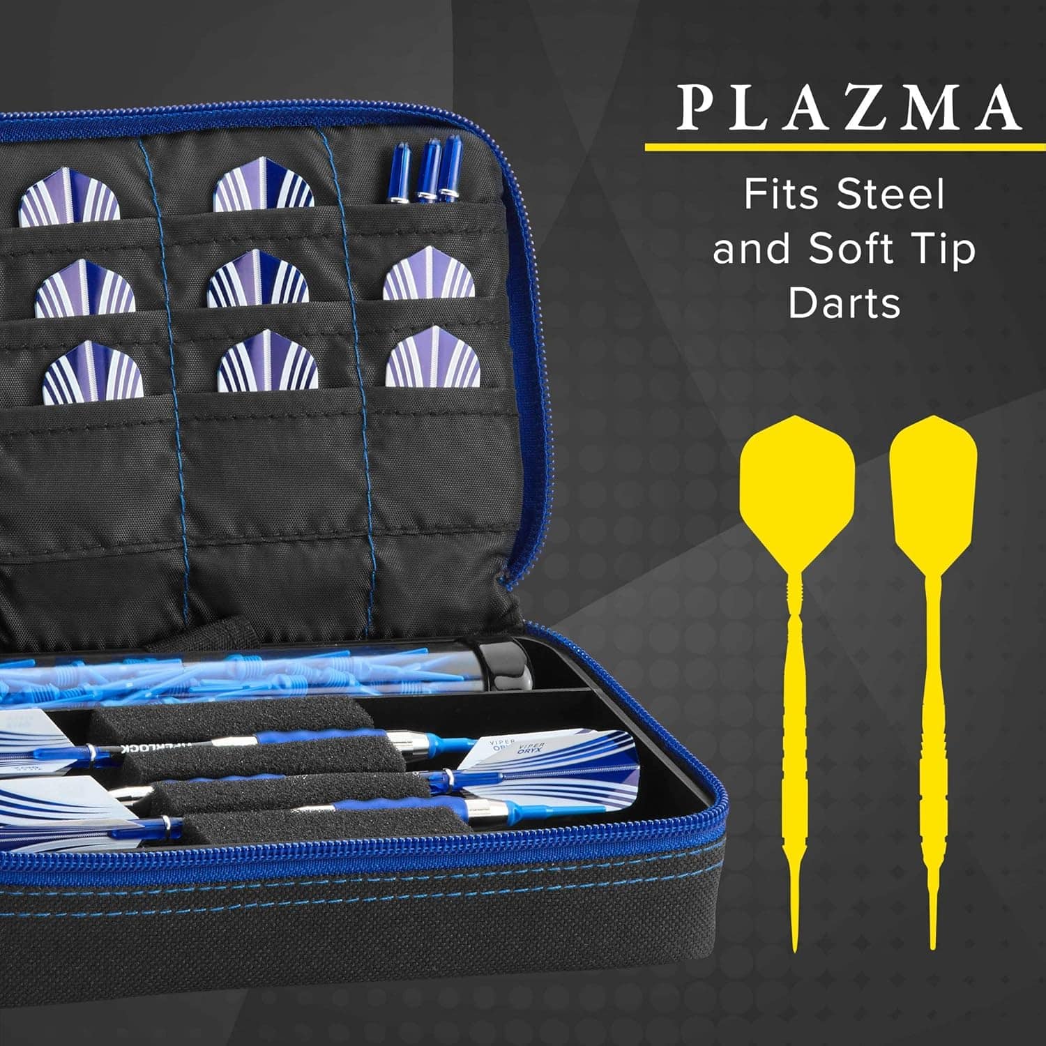 A zippered exterior pocket adds quick access for personal items or frequently used dart tools, while the striking black and sapphire color combination and subtle branding give it a bold, modern look. Compact yet comprehensive, the Plazma is ideal for both steel and soft tip players who want maximum organization without bulk.