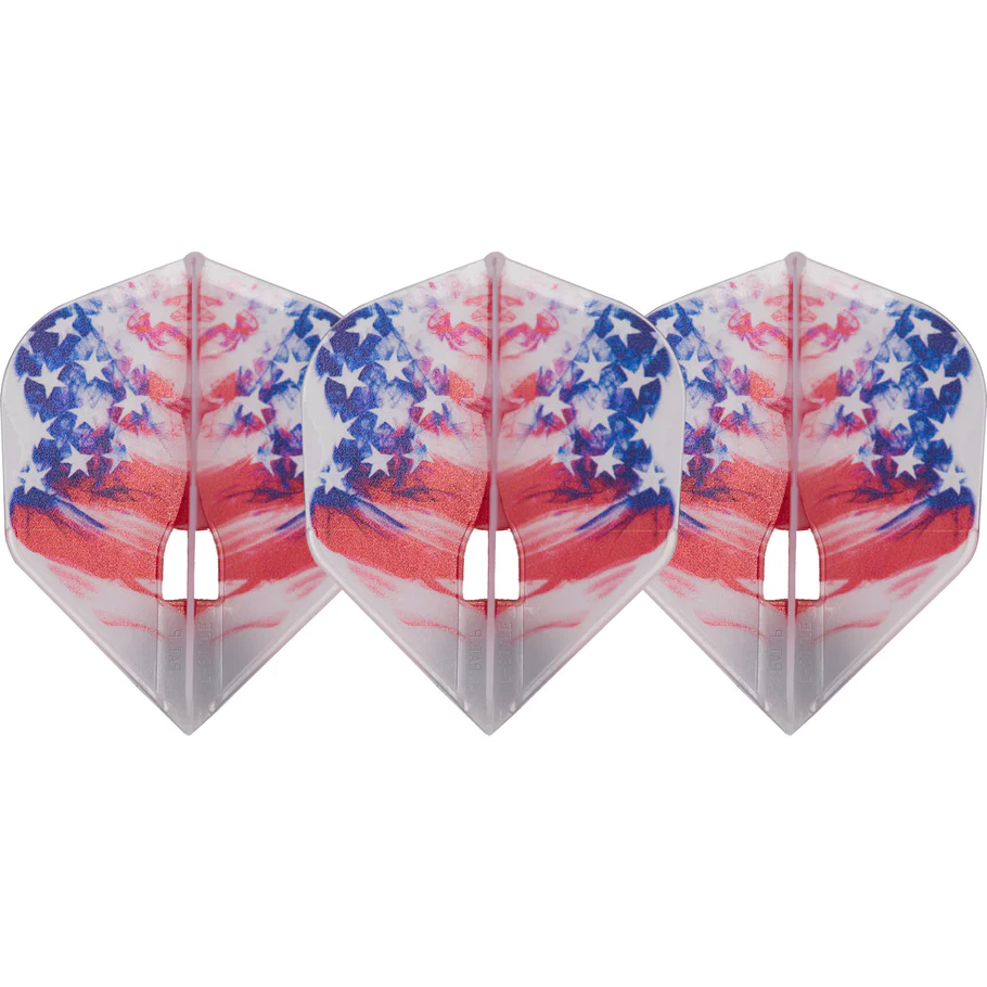 The L-Style L3 Pro Champagne Ring Flights in clear white with the American Flag offer a sleek, high-performance upgrade for serious dart players. These molded, one-piece flights hold 90-degree angles right out of the package—no shaping required. Built in Japan and distributed globally, they’re known for their precision and durability.