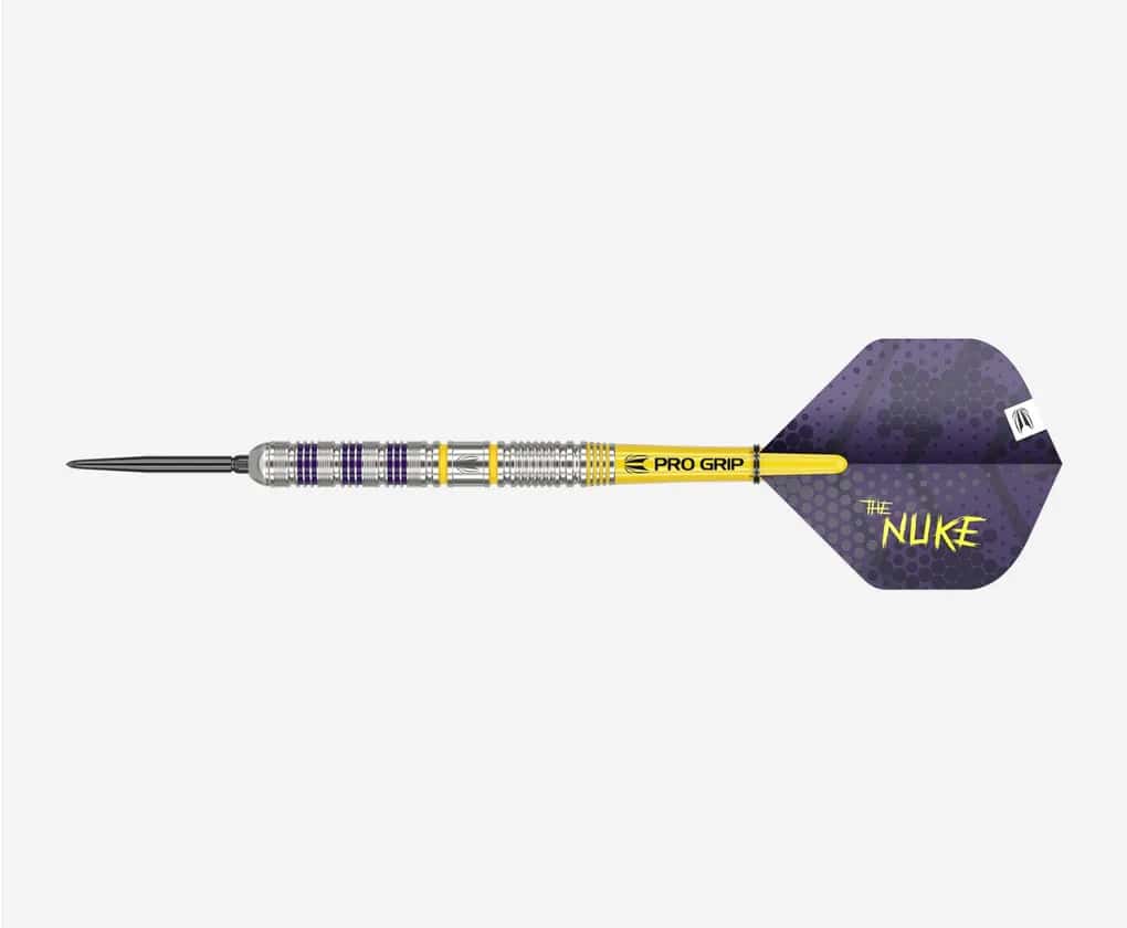 The straight 90% tungsten barrel measures 52mm, which provides a stable and controlled feel. In addition, the radial grooves enhance grip without feeling overly aggressive. Subtle accents of purple and yellow run through the grooves, so they reflect Littler’s signature style while maintaining a clean, professional look.