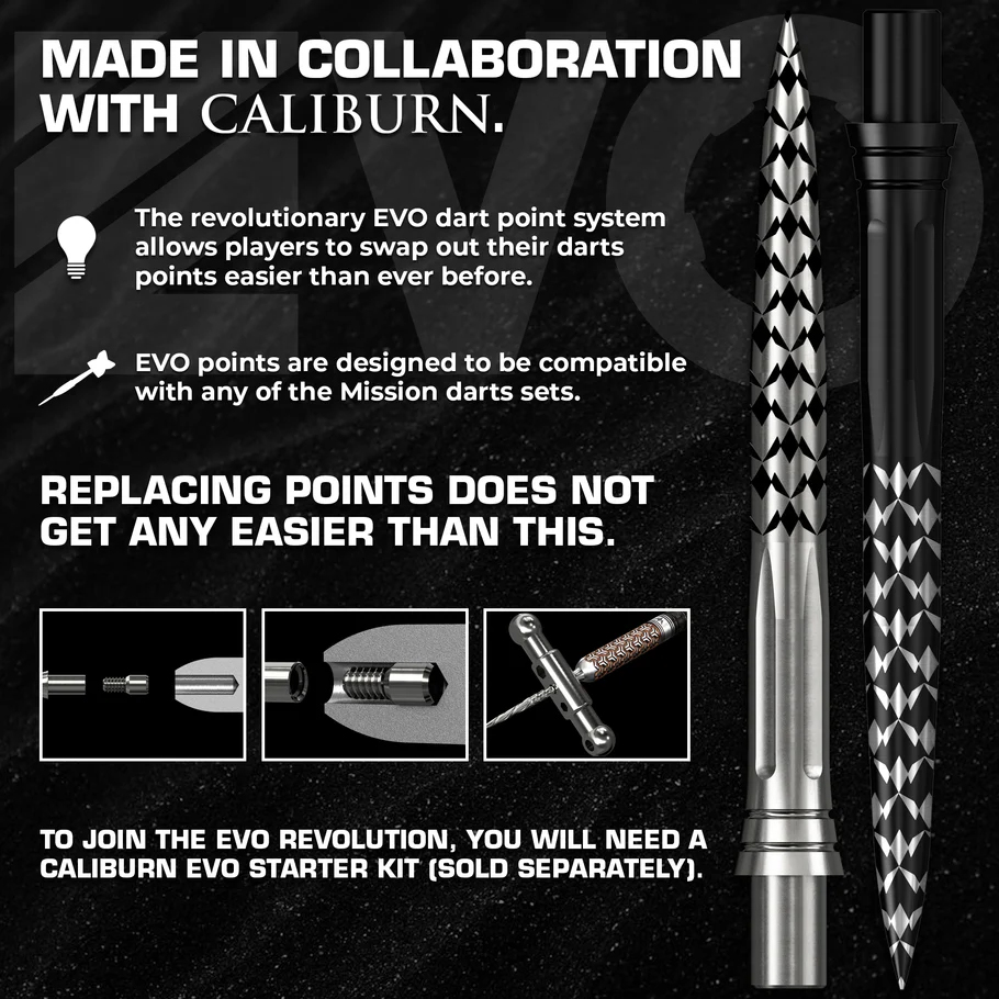 Upgrade your setup with the Mission Caliburn EVO Dart Points – Mission Logo – Black – 26mm, built for players who want speed, convenience, and consistency. Designed in collaboration with Caliburn, these points use the innovative EVO system, allowing you to swap dart points in seconds without the hassle of traditional repointing.
