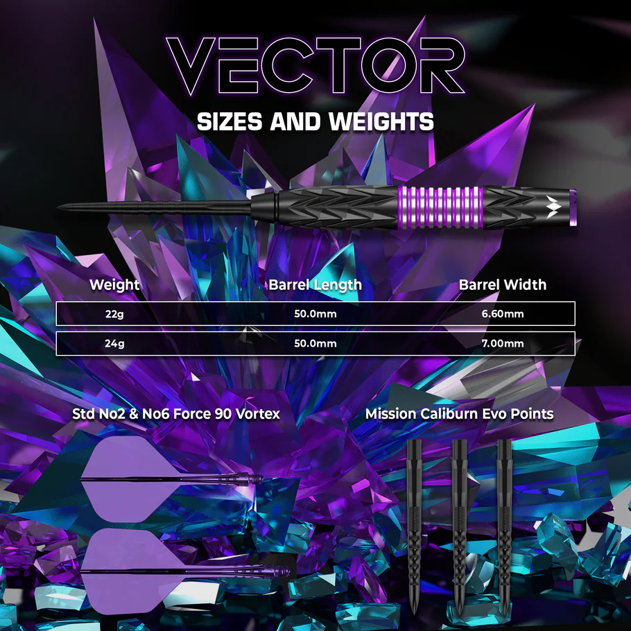 Toward the front, the barrel transitions into a smooth tapered nose. Consequently, the dart promotes a clean, predictable release as it leads into a smooth black Caliburn EVO point. To complete the setup, the Vector darts come fitted with tweenie transparent purple Mission Force 90 Vortex all-in-one flights. These flights enhance stability and durability straight out of the box. Furthermore, Mission includes a full range of accessories, making this set match-ready from day one.