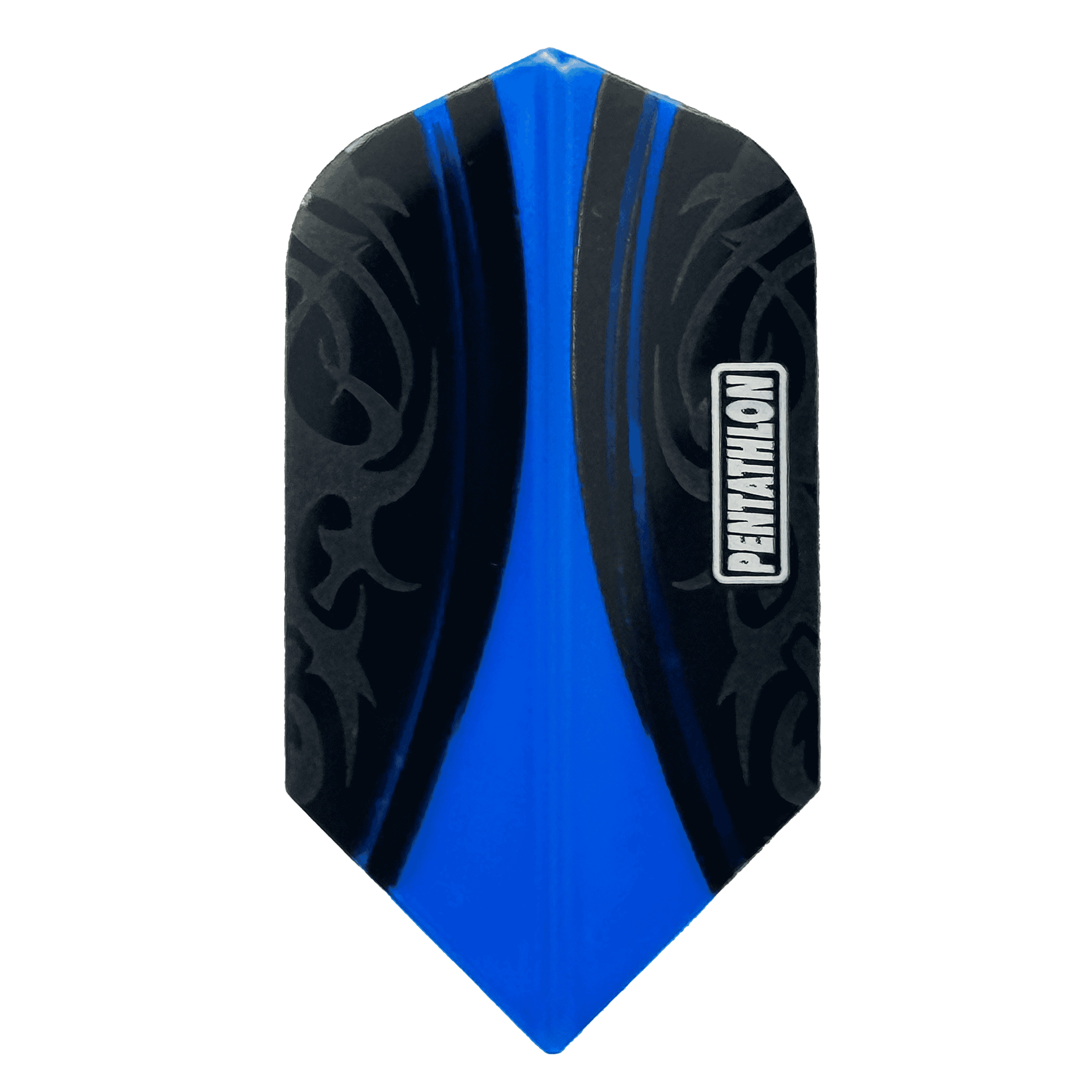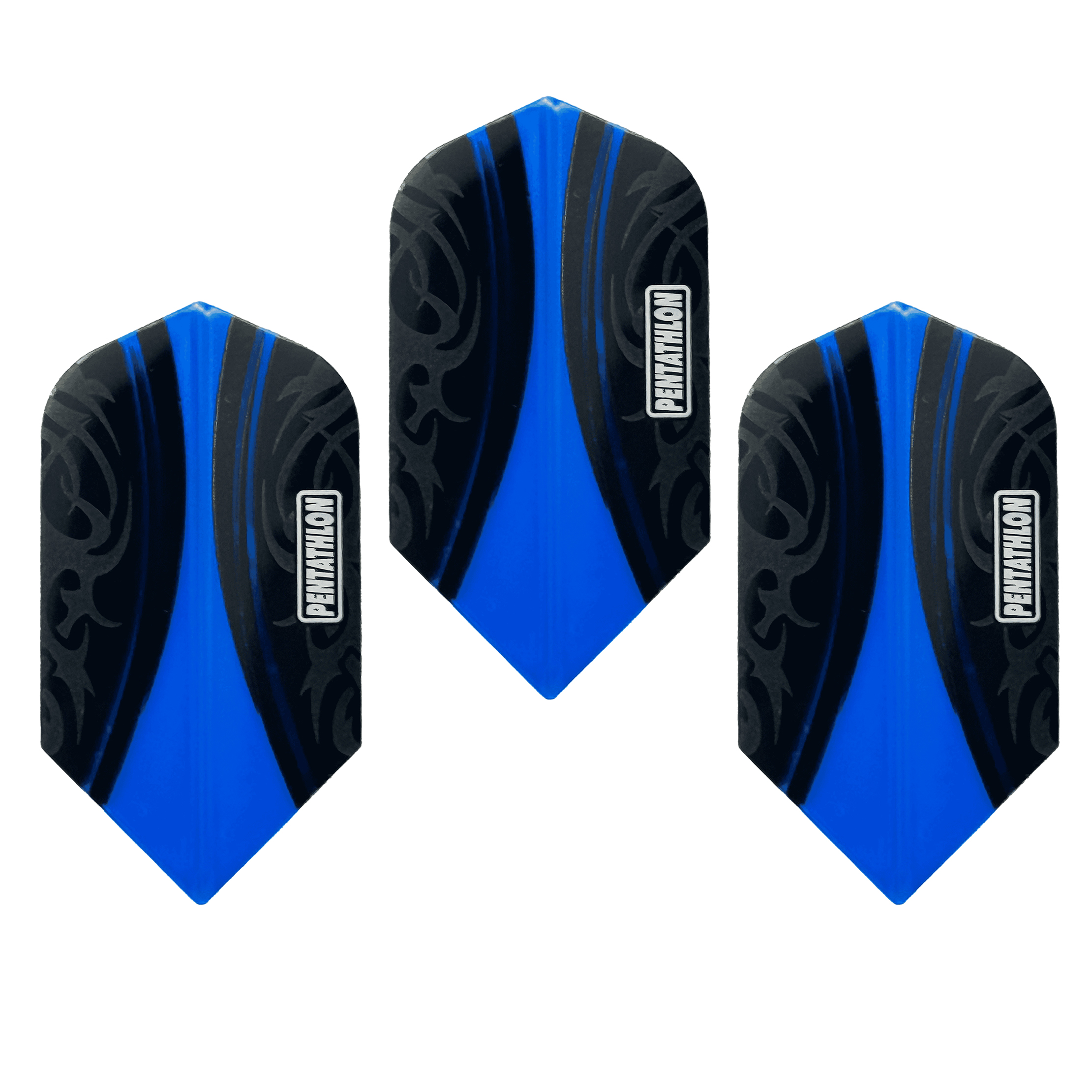 Bring bold style and dependable performance to your setup with the Pentathlon Tribal 100 Micron Dart Flights in slim translucent blue. These flights feature a sleek tribal-inspired design accented by deep blue and black tones, giving your darts a striking, modern look.