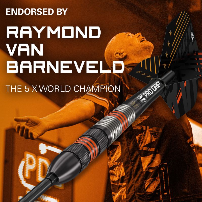 Created with five-time World Champion Raymond van Barneveld, the RVB 80 Black Generation 2 darts offer a precise, well-balanced feel. The 53mm barrel features a rear radial-grooved grip that adds stability. The front section includes knurled cuts and grooved rings, which work together to support a smoother and more accurate release. Additionally, the Black PVD coating, re-machined highlights, and orange bands give the darts a clean, signature RVB appearance.