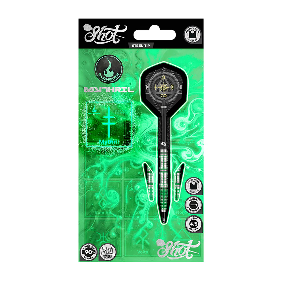 Crafted for speed and precision, the Shot Alchemy Mythril 24gm delivers a light, responsive feel with every throw. Inspired by a legendary alloy known for purity and strength, this dart is built for players who want effortless control and repeatable accuracy.
