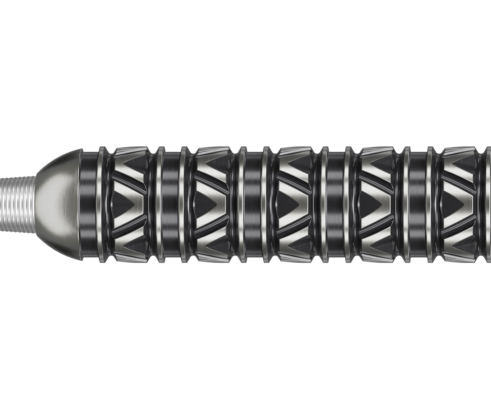 The straight 90% tungsten barrel offers a smooth, stable feel. Moreover, the front section features deep ring grooves arranged symmetrically with precision V-cut machining. This structure strengthens finger positioning and encourages a confident release. Meanwhile, the dual-zone grip layout provides clear feedback and reliable control. The front V-groove locks the fingers firmly, while the rear double-ring cut adds stability for players who prefer a back-weighted grip.