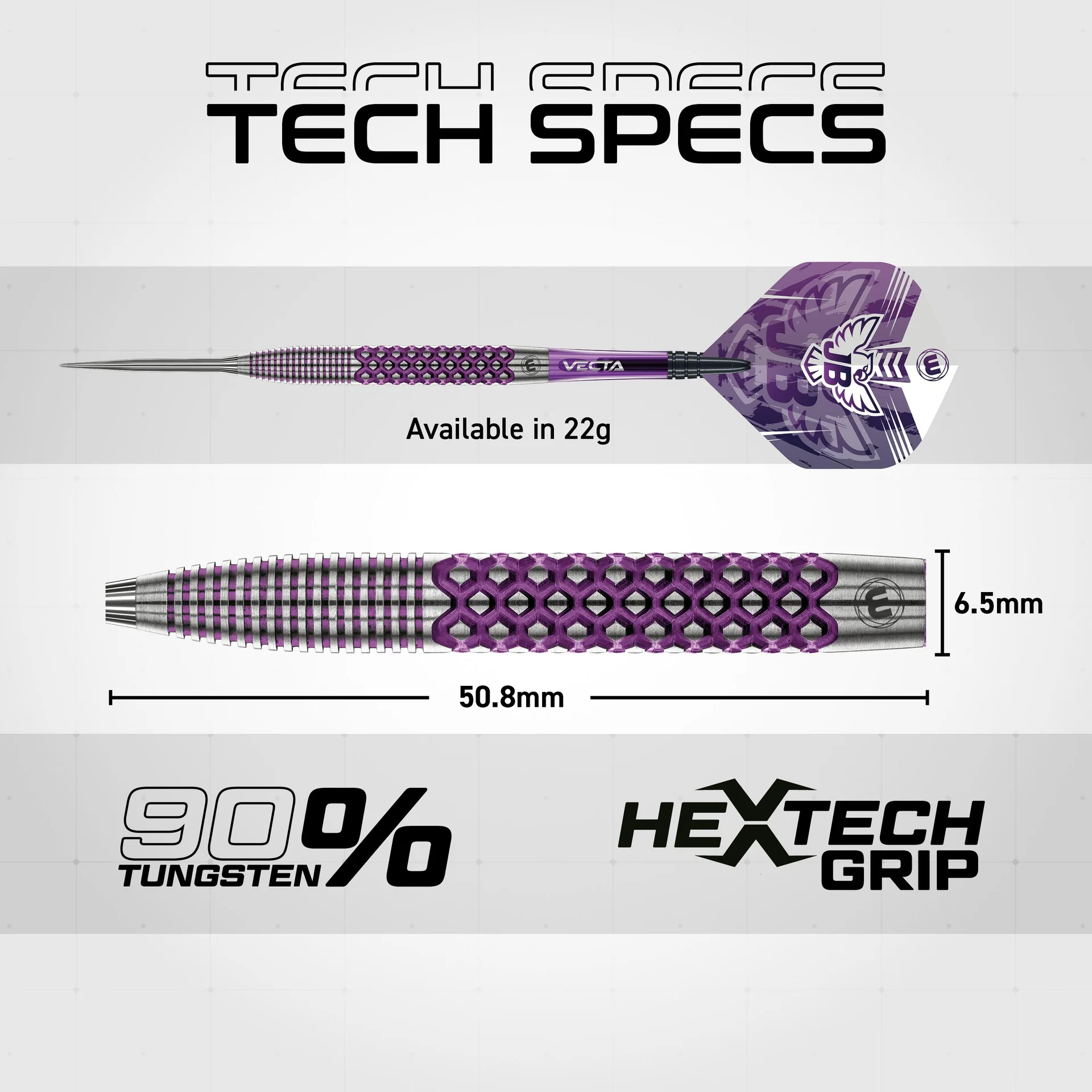 The full-length HexTech grip combines square grooves with a refined cut. Therefore, the dart offers strong traction without feeling harsh. Meanwhile, the tapered front profile supports clean finger placement and a controlled release. To finish the setup, the 32mm velocity silver effect steel point helps maintain consistent speed and stable flight.